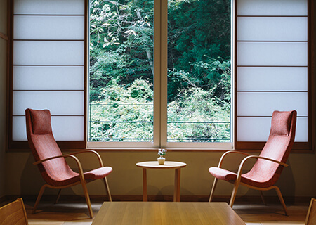 窓の外に広がる山々の風景と川のせせらぎは、時が経つのを忘れてしまうほど。主室の隣には、楢の無垢材を使用したベットルームを設置。